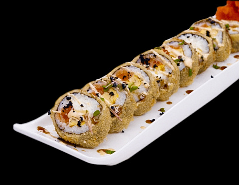 семга, сливочный сыр, тамаго, спайси соус, кляр, кунжут, масаго, унаги соус, соус том ям